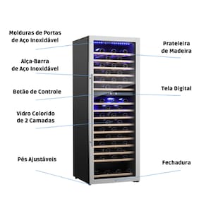 - Voltagem: 220V (100V 50/60 Hz a 220-240 V 50/60 140W) - Resfriamento: Ventilação por compressor - Temperatura gabinete interno: Superior: 5-22 ºC, Inferior: 12-22 ºC - Construção de estrutura estável e de alta qualidade - Compartimentos: 16 prateleiras ajustáveis - Painel de controle: Tela LCD - Iluminação interna: Luz LED azul - Porta com isolação térmica: 2 camadas de de vidro marrom anti - UV - Peso: 124kg - Dimensões da caixa: 78 cm (Largura) x 77 cm (Comprimento) x 204 cm (Altura) - Dimensões do produto: 70 cm (Largura) x 69 cm (Comprimento) x 189 cm (Altura)Capacidade total de garrafas