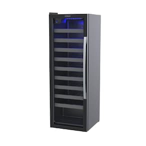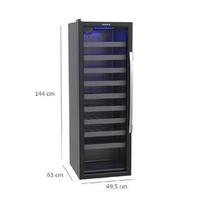 Adega de vinho com capacidade para 50 garrafas, porta invertida com abertura da direita para a esquerda, vidro duplo LOW-E que reduz a troca de calor com o ambiente externo e protege os rótulos contra raios UV, iluminação interna em LED azul, controlador de temperatura digital com ajuste entre 6C e 20C, sistema de refrigeração por compressor, degelo natural com dreno traseiro e recipiente de degelo, 9 prateleiras deslizantes e 1 fixa, pés frontais reguláveis e traseiros com rolete.Capacidade total de garrafas