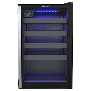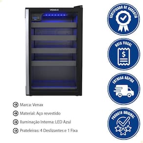 Adega climatizada com controle digital de temperatura, iluminação LED azul, porta de vidro duplo LOW-E, 4 prateleiras deslizantes removíveis e 1 fixa. Sistema de refrigeração com compressor.Capacidade total de garrafas