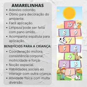 - O Adesivo para Chão Amarelinha é bem colorido e além de decorar é uma brincadeira muito divertida. É perfeito para decorar o quarto infantil de um jeito prático e rápido. Em 10 minutos já fica tudo pronto pois é muito fácil de aplicar. As crianças podem ajudar na decoração, assim, decorar o quarto vira um momento descontraído entre pais e filhos. Será pura diversão