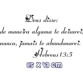 Adesivo de parede hebreus 13:5 Medida: 85 x 43 cm As imagens anunciadas são ilustrativas Tamanho do adesivo O adesivo da foto parece grande Então atenção: O modelo que está na foto não se refere ao tamanho do adesivo anunciado. deixamos o adesivo grande para que você possa visualizar melhor o produto que está comprando Vantagens: - já vai recortado - fácil aplicação e sem sujeira, não precisa de cola. - acompanha manual impresso. - renovação do ambiente. É o fim das paredes brancas, sem vida Onde aplicar Em qualquer superfície lisa. Onde não aplicar Paredes úmidas, superfícies porosas, com relevo, com texturas, irregularidades ou com infiltrações. Local para aplicação: aplique onde sua imaginação mandar paredes, móveis, revestimentos, azulejos, tetos, janelas, portas, vitrines, vidraças, , carros, notebook, banheiro, geladeira e muito mais. Marca: Não Informado Ean: 8001250018151