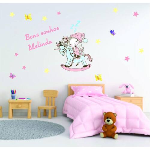 Adesivo De Parede Menina Dormindo E Unicórnio Com Nome Medida do unicórnio montado - 50cm. Acompanha 4 borboletas e 15 estrelas - a frase e o nome que é editável -a aplicação é simples, é só limpar bem a superfície onde será aplicada, remover o papel da película e aplicar. - nossos adesivos decorativos são fabricadas com adesivos de alta qualidade e durabilidade. - pode ser aplicado em qualquer superfície lisa. - são super resistentes aos raios solares e a umidade. Podem ser aplicados em qualquer superficie lisa e limpa. O adesivo pode ser aplicado na posição que desejar Não propagam o fogo São atoxicos e anti-alérgicos Observação: o adesivo deverá ser montado no momento da aplicação Marca: Ra Personalize