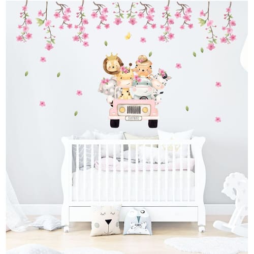 Adesivo de Parede Safari Jeep Rosa Boho Ramos de Cerejeira Adesivo de Parede Safari Jeep Rosa Boho Ramos de Cerejeira