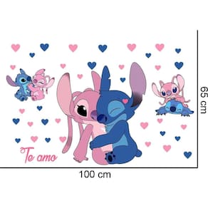 Adesivo de parede stitch e angel Medida: 100 x 65 cm As imagens anunciadas são ilustrativas Tamanho do adesivo O adesivo da foto parece grande Então atenção: O modelo que está na foto não se refere ao tamanho do adesivo anunciado. deixamos o adesivo grande para que você possa visualizar melhor o produto que está comprando
