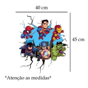Adesivo de parerde buraco falso mini herois Medida: 40 x 45 cm As imagens anunciadas são ilustrativas Tamanho do adesivo O adesivo da foto parece grande