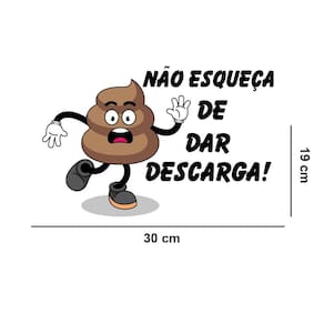 Adesivo de vaso sanitário não esqueça da descarga Medida: 30 x 19 cm Atenção as medidas Os adesivos decorativos são produzidos com material de alta qualidade. As imagens anunciadas são ilustrativas