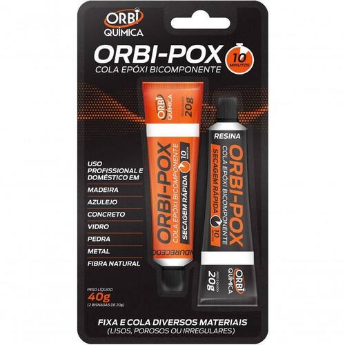 O ORBI EPÓXI é uma cola multiuso bi-componente muito utilizada no segmento industrial como também no uso doméstico e . Proporciona colagem e reparos quase invisíveis e altamente residentes. Sua praticidade de uso cola diversos materiais tais como: bijuterias, metais, plásticos rígidos, porcelana, borracha, vidros, Mamoré, azulejo, cerâmica, concreto, cortiça, borracha vulcanizada, ferro, aço inox, alumínio, bronze, ouro, latão, cobre, prata, madeira, jóias, estátuas, etc. Não é recomendado para uso em plásticos flexíveis. Adesivo de cura inicilal de 10 minutos e total 24 horas. Pode ser utilizado para preencher irregularidades ou cavidades em superfícies. Indicado para colagem