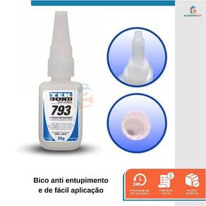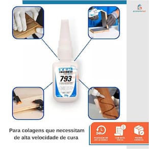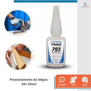 CARACTERÍSTICAS TÉCNICAS: Material: Cianoacrilato Temperatura de operação: -55 a 80 ºC Preenchimento de folgas: Até 10 mm Resistência ao Cisalhamento (Aço x Aço): = 100Kgf/cm2 Textura: Líquida Viscosidade: 70 a 120 cP Cura total: 24 hrs Local indicado: Multiuso Tipos de adesivo: Selante Tipo de colagem: Instantânea Local de aplicação: Uso Geral Cor: Branco Peso líquido: 20g Marca: Tekbond Ref.: 3698424