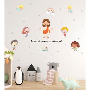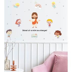 Medida: 01 Kit de Adesivos contendo: 55 Adesivos 01 Adesivo de Jesus com 30cm 04 Crianças com 17cm cada 02 Anjinhos de 15cm cada 01 Arco iris de 15cm 01 Pombo de 10cm 01 Biblia de 12cm Texto com 44cm 44 estrelinhas opara espalhar