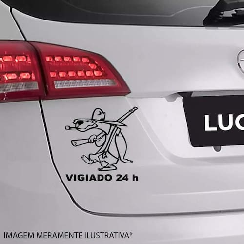Adesivo para carro vigiado 24h Cor: preto As imagens anunciadas são ilustrativas Tamanho do adesivo O adesivo da foto parece grande Então atenção: O modelo que está na foto não se refere ao tamanho do adesivo anunciado. deixamos o adesivo grande para que você possa visualizar melhor o produto que está comprando