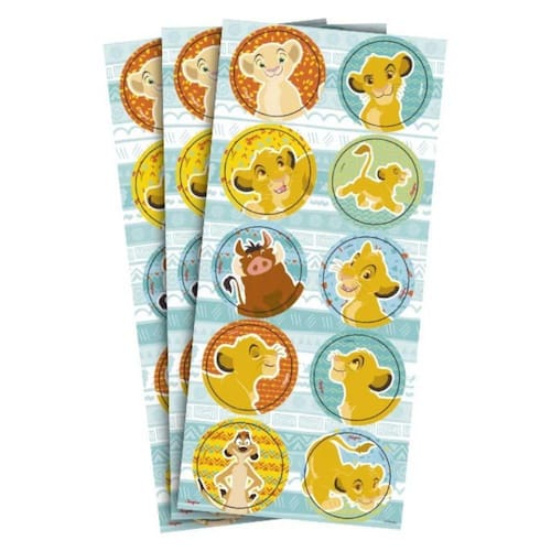 Conjunto com 30 adesivos temáticos do Rei Leão para uma decoração encantadora.