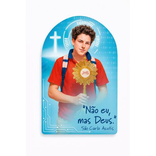 Adesivo Resinado Imagem de São Carlo Acutis – “Não eu, mas Deus”
