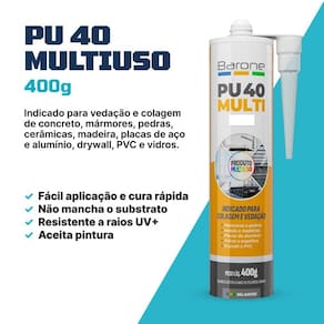 BARONEFLEX PU 40 MULTI é um selante elástico multiuso, que cura com a umidade do ar, destinado a vedações, calafetações verticais e horizontais e diversos tipos de substratos.