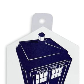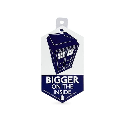 - Adesivo estelar: este adesivo colecionável oficialmente licenciado apresenta uma imagem da caixa policial TARDIS e a frase "Bigger On The Inside".