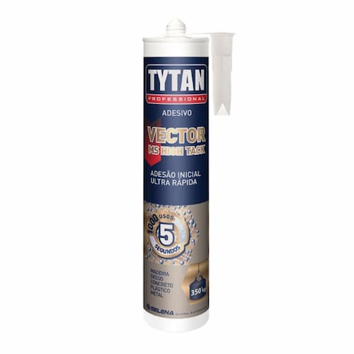 Adesivo vector ms high tack tytan pro fessional é um adesivo de agarre rápido, permanentemente elástico à base de ms polímero. É recomendado para a colagem de todos os tipos de materiais de construção. Não contém solventes e isocianatos. Fixa e forma uma conexão resistente à intempéries, raios uv e vibrações.VANTAGENSAdesão rápida a todas as superfíciesAdesão inicial em 5 SegundosResistência a raios UV e ChuvaTecnologia MSConexão fl exívelResistência a fungos e bactériasAdesão a diversos tipos de substratosForma uma conexão durávelAPLICAÇÃOColagem de todos os tipos de materiais de construção como: concreto, gesso, madeira, tijolo e vidroColagem de elementos feitos de madeira, gesso, cortiça, compensado, metal, pedras, espuma de poliestirenoColagem de rodapés, entradas de portas, painéis, cerâmicasColagem de lã de vidro e mineralESPECIFICAÇÕESPeso Líquido: 420 gCor:BrancoEmbalagem:Cartucho 310 mlTemperatura de trabalho:+5°C até 25°CTemperatura de armazenamento:+5°C até 25°CDensidade: 1,47 g/cm³Formação de película: 15 minutosTempo de cura: 72 horasValidade: 12 meses