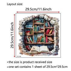 Material: PVC Tamanho: 29,5 x 29,5 cm Design 3D criativo Efeito exclusivo de parede quebrada com uma estante cheia de livros coloridos e um diário aberto, criando a ilusão de um verdadeiro canto de biblioteca. Educacional e artístico Perfeito para adicionar uma atmosfera intelectual e inspiradora às salas de estudo, salas de aula ou bibliotecas domésticas. Material de PVC durável Feito de PVC impermeável e ecológico, autoadesivo e removível sem deixar resíduos, adequado para decoração de parede de longa duração. O tamanho compacto mede 29,5 x 29,5 cm, ideal para decorar pequenas áreas de parede, cantos de estudo, estantes de livros ou até móveis como armários e portas. Fácil de aplicar A aplicação Peel-and-Stick funciona em superfícies lisas, como paredes pintadas, vidro, azulejos ou painéis de madeira, para facilitar a decoração.