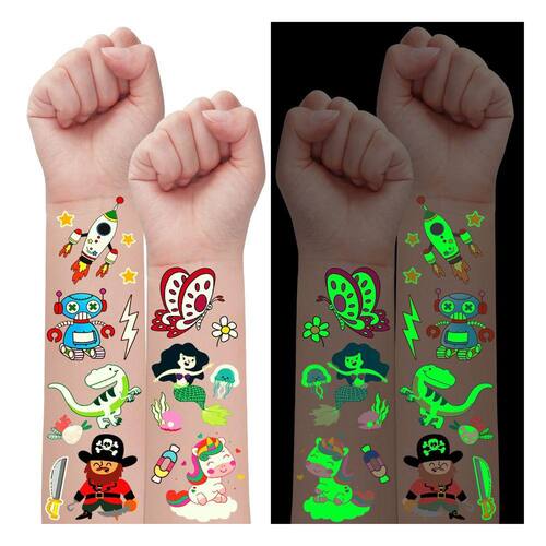 -?Adesivos de tatuagens temporárias luminosos para crianças?Essas tatuagens luminosas tornarão você única na festa e brilharão à noite. Elementos fofos incluem unicórnio, sereia, boleta, fada, dinossauro, tubarão, espaço, robô, pirata, carros, etc. Você está procurando adesivos de tatuagem fofos para crianças sem gastar muito dinheiro? As tatuagens temporárias Party são a escolha perfeita!