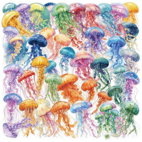 50 designs vívidos de medusas — Inclui 50 decalques transparentes de medusas em tons pastel e aquarela, ideais para realçar qualquer superfície com um toque oceânico e etéreo. Material PET de alta qualidade — Feitos de PET à prova d'água, esses adesivos oferecem bordas nítidas, impressão vibrante e são perfeitos para colocar em camadas em diários e agendas. Transparente e à prova d'água — Cada decalque é à prova d'água e resistente a óleo, projetado para permanecer vivo e intacto mesmo em garrafas de água ou itens externos. Ampla variedade de aplicações — Ótimo para decorar laptops, skates, álbuns de recortes, diários, capas de telefone, guitarras e acessórios de viagem. Fácil de usar e remover — Descasque e cole facilmente sem rasgar ou deixar resíduos de adesivo, tornando-os adequados para crianças e adultos.