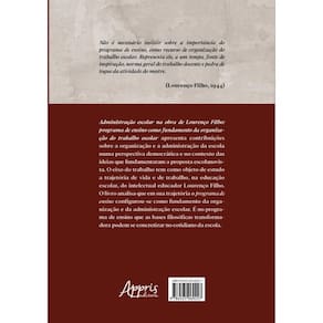 Administração escolar na obra de Lourenço Filho: programa de ensino como fundamento da organização do trabalho escolar apresenta contribuições sobre a organização e a administração da escola numa perspectiva democrática e no contexto das ideias que fundamentaram a proposta escolanovista. O eixo do trabalho tem como objeto de estudo a trajetória de vida e de trabalho, na educação escolar, do intelectual educador Lourenço Filho. O livro analisa que em sua trajetória o programa de ensino con?gurou-se como fundamento da organização e da administração escolar. É no programa de ensino que as bases ?losó?cas transformadora podem se concretizar no cotidiano da escola.