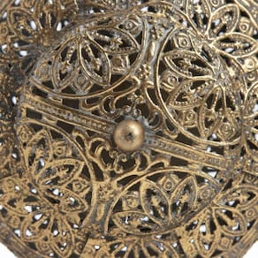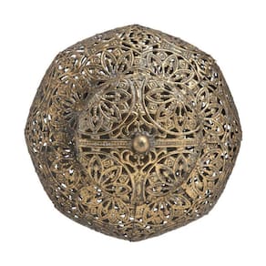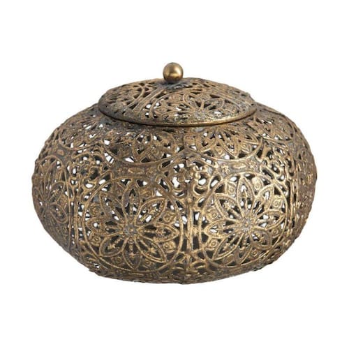 O Potiche Isra é produzido em metal vazado com 16 cm e possui tampa, com acabamento em dourado envelhecido.