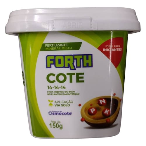 * O COTE NPK 14-14-14 (150g) FORTH é um adubo mineral misto encapsulado. * Ideal para nutrir suas plantas durante todo o ciclo de crescimento. * Fornecendo os nutrientes nitrogênio (N), fósforo (P) e potássio (K) em proporções iguais (14% de cada).