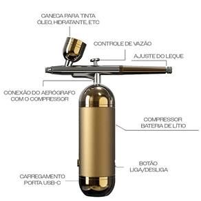 Aerógrafo Caneta Pintura Compressor a Bateria Sem Fio USB-C Dourado Dremax - Marca: Dremax - Referência: FPN004 - Cor: Dourado - Carregamento por USB-C - Bico de 0.3mm - Indicado para pintura, detalhamento, retoque automotivo, manicure, pintura de bolos, cabelos, tatuagem, maquiagem, e tudo que a sua imaginação permitir - Se utilizado como pulverizador facial, propicia rejuvenescimento e hidratação profunda da pele, para maior elasticidade e maciez - Prático, leve e portátil - Bateria Recarregável de Lítio 1.200mah Inclusa - Tempo de carregamento 1 a 2 horas - Autonomia média: 60 minutos - Acompanha Cabo USB C e dois recipientes para líquidos/tintas: 6ml e 30ml - Garantia: 90 dias Marca: Dremax