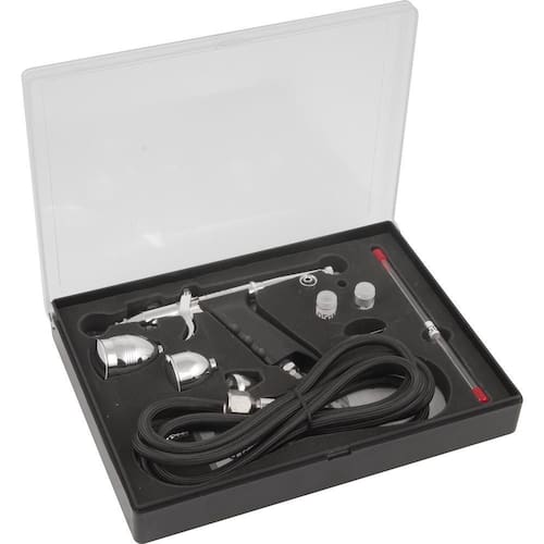 Aerógrafo com acessórios 16 peças Vonder. Proporciona baixo consumo de ar, com excelente precisão e desempenho. Indicado para trabalhos artesanais e atividades que exijam precisão e qualidade, como: micropinturas, retoques, personalização de veículos, capacetes, tanques de motos, entre outros. Pode também ser utilizado com produtos alimentícios e outros. Tais como: culinária, confeitaria, pinturas corporais, maquiagem. CARACTERÍSTICAS Consumo de ar do aerógrafo 0,39 pcm 11 L/min Pressão de trabalho do aerógrafo PSI 15 lbf/pol² - 50 lbf/pol² Rosca de entrada de ar do aérografo 1/8 NPT macho Capacidade da caneca 2 ml, 5 ml e 13 ml Material Cobre Diâmetro do bico 0,2 mm, 0,3 mm e 0,5 mm Massa aproximada com acessórios 330 g - E CDC legal: 90 dias + contratual: 3 meses 1 Aerógrafo com 16 acessórios sendo: 1 Ferramenta de aplicação, 1 mangueira com 1,8 metros, 3 copos 2 ml, 5 ml, 13 ml , 3 bicos 0,2 mm, 0,3 mm, 0,5 mm , 3 agulhas 0,2 mm, 0,3 mm, 0,5 mm , 1 chave, 1 adaptador 1/4 NPT fêmea - 1/8 NPT macho , 2 conectores para mangueira rosca 1/8" NPT fêmea com espigão 3/16" e 1 tubo de sucção