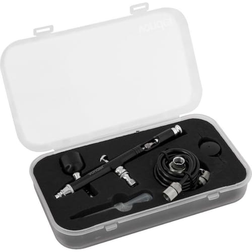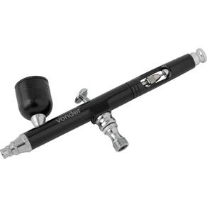 Conteúdo da embalagem: 1 Aerógrafo com 7 acessórios, sendo: 1 pistola com caneca 7 ml e válvula de entrada, 1 adaptador 1/4" fêmea x 1/8" macho, 2 adaptadores 1/8 com espiga, 1 tubo de sucção, 1 chave e 1 mangueira de ar de 1,8 m.