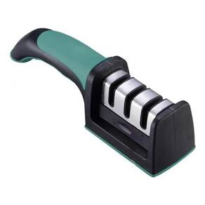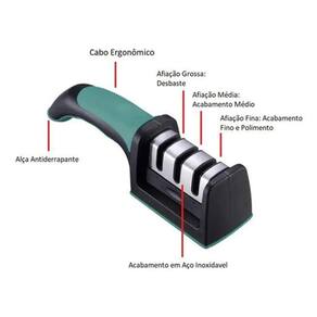 CARACTERÍSTICAS Indicado para afiar facas com lâminas de aço inox. Não é indicado para facas serrilhadas. Cabo anatômico, com detalhe emborrachado. Com base emborrachada.