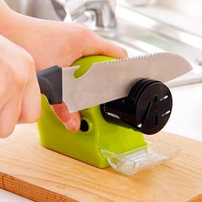 Afiador elétrico portátil, afia facas de cozinha e facões com precisão. Equipado com pedra de amolar de alta velocidade. Possui acessório removível. Necessita de 4 pilhas AA (não inclusas). Acompanha coletor de pó.