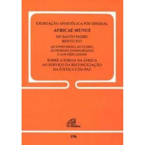 Este documento traz as conclusões da Segunda Assembleia Especial para a África, realizada de 4 a 25 de outubro de 2009, sobre o tema: a Igreja na África ao serviço da reconciliação, da justiça e da paz. Situa-se na continuidade da Assembleia de 1994, que se revelou um acontecimento de esperança e de ressurreição, no momento mesmo em que as vicissitudes humanas pareciam antes impelir a África para o desânimo e o desespero./nAtravés deste documento, o Papa Bento XVI deseja oferecer os frutos e os estímulos do Sínodo e convidar todos os homens e mulheres de boa vontade a considerar a África com um olhar de fé e caridade, para ajudá-la a tornar-se, por meio de Cristo e do Espírito Santo, luz do mundo e sal da terra (cf. Mt 5,13.14). /n