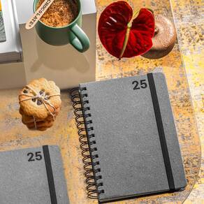 A agenda A5 é confeccionada em material reciclado, oferecendo uma opção sustentável e elegante para suas necessidades de organização.