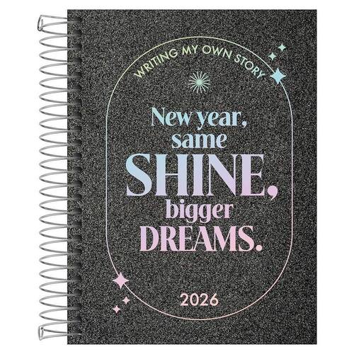 Se você busca um produto inspirado nas principais tendências de moda para se organizar, a agenda espiralada shine da tilibra é a escolha perfeita. O produto tem tamanho 11,7 x 16,4 cm, capa dura revestida com material especial brilhante e detalhes metalizados, bolsa de papel, adesivos em dobro e folhas com visão de 1 dia por página, exceto aos sábados e domingos. Esta agenda 2026, que possui 176 folhas, é escolha ideal para manter todas as tarefas e compromissos bem programados. Detalhes: bolsa: de papel decorada capa: com material especial e dura capa acabamento: com detalhe holográfico conteúdo: controle financeiro e listas folha de adesivos: dupla material: especial produto certificado: fsc visão: diária exceto sábado e domingo formato: 117mm x 164mm gramatura: 63 g/m número de folhas: 176 folhas atenção: imagem meramente ilustrativa. Pode ocorrer mudanças no tom da cor da tela do celular/pc para o produto real ou mudanças na embalagem do produto sem aviso prévio por parte do fabricante.