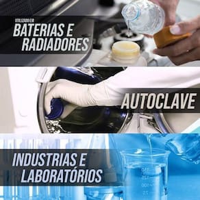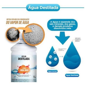 Bem Vindo Água Destilada Togmax 5 Litros O que é Agua Destilada O produto tem esse nome porque passa por um processo de destilação, ou seja, enfrenta uma evaporação e condensação do vapor da água. Sendo assim, tem seus minerais e impurezas removidos - entre eles, metais e microrganismos.Para a destilação em laboratório, a água passa por um conjunto de balão de destilação, condensador, chapa de aquecimento e um recipiente. Então, é preciso colocar a água no balão para acontecer a vaporização. Esse vapor é encaminhado para o condensador, ou seja, é lá que o vapor vira água líquida. Em conclusão, ela cai no recipiente já como água destilada. Para que serve A água destilada tem diversas funções na indústria, especialmente como reagente ou solvente em processos químicos. Assim, é usada em laboratórios, hospitais e consultórios odontológicos. Por exemplo: Produção de cosméticos; Limpeza de vidros; Fabricação de baterias de carros; Esterilização de materiais cirúrgicos; Rega de plantas. Pode beber água destiladaSim, mas de maneira moderada e com a recomendação de um médico ou nutricionista. Diferente da água potável comum, como já citado, a destilada não conta com minerais, entre eles o cálcio e magnésio. Eles são de suma importância para manter o organismo funcionando, por isso, o ideal é beber água comum. O que causa no organismo Com a falta de minerais na água destilada, o consumo excessivo ou de longo prazo da mesma pode gerar desidratação, mau desenvolvimento dos ossos, cansaço físico e outras questões musculares.Portanto, se a ingestão da água for por motivos médicos, é importante acompanhamento nutricional para suprir todas as necessidades que o organismo precisa.Composição Água DestiladaCuidados Água imprópria para consumo humano NÃO INGERIR