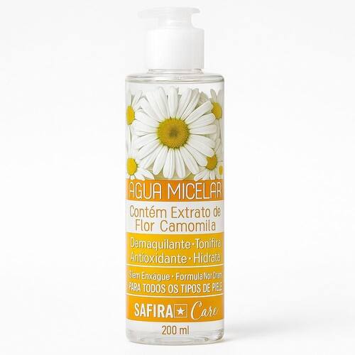 A Água Micelar Demaquilante Safira 100ml é ideal para remover impurezas, oleosidade e maquiagem com delicadeza e eficiência. Sua contém extrato de camomila, que acalma e suaviza a pele, além de oferecer ação antioxidante, hidratante e tonificante.