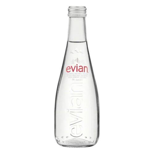 Marca: Evian Origem: Alpes Franceses Embalagem: Garrafa 330ml Tipo: Água Mineral com Gás Processo: Filtrada através de camadas de glaciais ricos em minerais por mais de 15 anos Engarrafamento: Evian-les-Bains, França, desde 1826