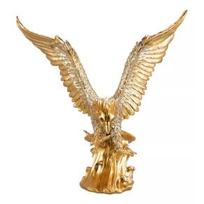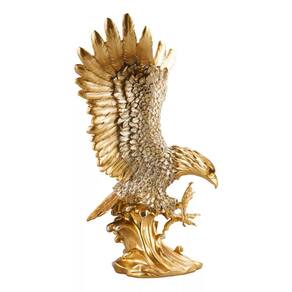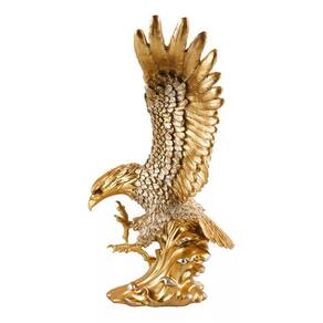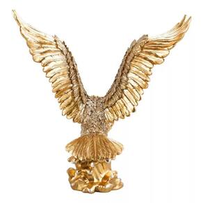 Enfeite decorativo no formato de uma águia em posição de ataque com 40,5 cm de altura e 40 cm de largura de asa até asa. Cor dourada e detalhes realista. Material: resina