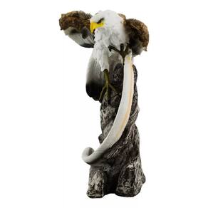 Enfeite decorativo no formato de uma águia em cima da rocha decorado com uma pena longa. Peça com 24.5 cm de altura e 13 cm de largura. Cores realista. Material: resina