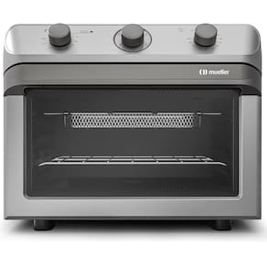 Air Forno Elétrico Mueller com função Fryer e Turbo. Assa mais rápido com a função Turbo. Frita sem óleo com a função Fryer. Possui Timer de 120min ou contínuo, alarme sonoro, luz interior, controle de temperatura, grill, bandeja para resíduos e bandeja Fryer. Resistências blindadas e isolamento térmico. Variação de temperatura de 50 a 250C. Janela de exaustão. Porta com vidro duplo. 1 prateleira com 5 níveis de altura.Forno autolimpante