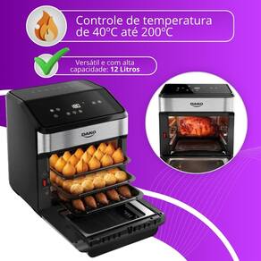Com capacidade para 12 litros, você prepara porções generosas, assa um frango inteiro no espeto giratório, frita sem óleo, aquece, desidrata e descongela alimentos com precisão.
