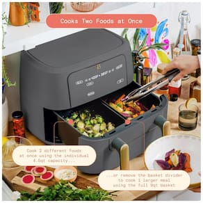 Fritadeira elétrica de ar de 9 litros com sistema de dupla zona independente, permitindo o preparo simultâneo de dois alimentos com tempos e temperaturas diferentes ou o uso de um cesto único de grande capacidade. A estrutura em aço inoxidável e o aquecimento de 1700W garantem circulação de ar quente eficiente para cozimento uniforme em diversos tipos de preparo.