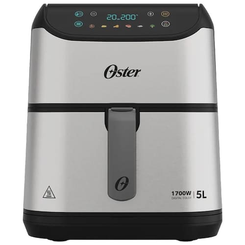 Air Fryer Digital Oster OFRT930 com capacidade de 5 litros, design em aço inox, painel digital com funções pré-programadas, timer de 60 minutos e temperatura ajustável de 80°C a 200°C.Porta-fio