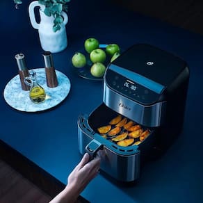 Air Fryer Digital Oster OFRT930 com capacidade de 5 litros, painel digital com funções pré-programadas, temperatura ajustável de 80°C a 200°C, timer de 60 minutos e grelha removível com revestimento de teflon Easy Clean.Porta-fio