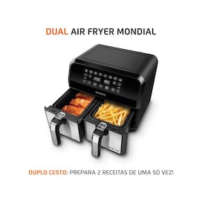Ficha Técnica Marca Mondial Referência 75667-01 Modelo AFD-01-BI Linha Dual Modo de Fritura sem Óleo / Air Fryer Capacidade Total 8L Capacidade do Cesto 4L Cesto de Fritura Duplo cesto e a tecnologia DualZone, você prepara 2 receitas simultaneamente, com Tempos e Temperaturas diferentes em cada cesto. Prepara Carne, batata frita, pão de queijo, nuggets, postas de salmão, legumes e etc Potência 2000W Temperatura 200°C Funcionalidades Timer, Desligamento Automático Voltagem 127V Consumo Aproximado de Energia 2,0Kw/h Material PP e Inox Cor Preto e Inox Certificado Homologado pelo Inmetro Número BRA23/00069 Peso do Produto 7Kg Peso do Produto com Embalagem 8,5Kg Dimensões do Produto Largura: 30,7cm - Altura: 37,8cm - Profundidade: 38,2cm Dimensões do Produto com Embalagem Largura: 37cm - Altura: 43,7cm - Profundidade: 41,5cm Prazo de Garantia 01 ano (3 meses de garantia legal e mais 9 meses de garantia especial concedida pelo fabricante). SAC do Fornecedor sac@emondial.com Recursos Tecnologia Dualzone, Cesto Duplo, Função Sincronizar, Painel com 11 receitas pré-programadas Conteúdo da Embalagem 1 Fritadeira, 1 Livro de Receitas e Manual de Instruções