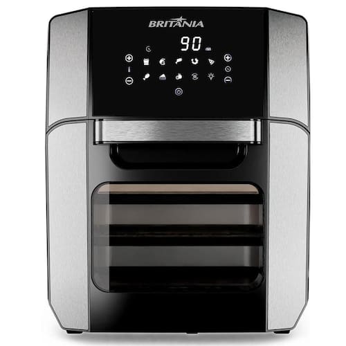 Air Fryer Oven Britânia 12L, 4 em 1 (forno, air fryer, desidrata e reaquece), timer de 90 minutos, temperatura ajustável de 80 a 200 graus, painel digital, cesto antiaderente, proteção contra superaquecimento e luz interna.Porta-fio