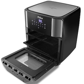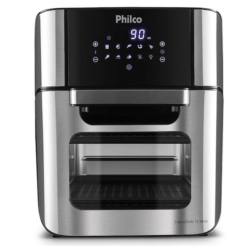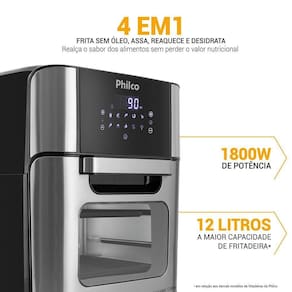 Air Fryer Oven Philco 12L, 4 em 1, 1800W, timer de 90 minutos, temperatura ajustável de 80°C a 200°C, função desidratar, painel digital com 9 funções pré-programadas, cesto antiaderente e acessórios inclusos.Porta-fio