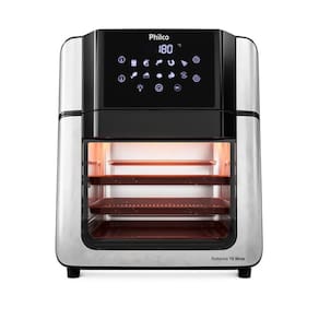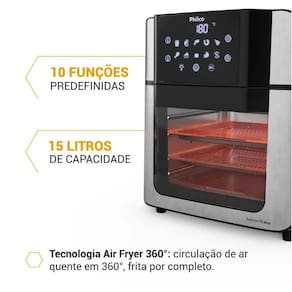 Air Fryer Oven Philco 15L 2 em 1 com Painel Digital, temperatura ajustável de 80° a 200°C, timer de 90 minutos, função desidratar, cesto com revestimento antiaderente Redstone e porta removível.Porta-fio