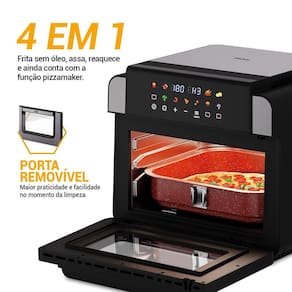 Capacidade do cesto de alimentos: 4,5L (forma quadrada) Capacidade da cuba (cavidade interna): 15L Tipo de cesto: forma quadrada com alça removível Potência: 1800W (dupla resistência – 1800W superior e 1500W inferior) Controle de temperatura: 80°C a 200°C (superior) + H1, H2 e H3 (inferior) Revestimento antiaderente Redstone nos acessórios Cesto com trava de segurança Painel digital com luz indicadora de funcionamento Desligamento automático Base antiderrapante Sistema de proteção contra sobreaquecimento Não possui porta fio Assadeira, coletor e forma podem ir à lava-louças Comprimento do cabo: 90cm exposto Timer de até 60 minutos Acabamento em inox 9 funções pré-programadas Porta removível Display digital colorido.