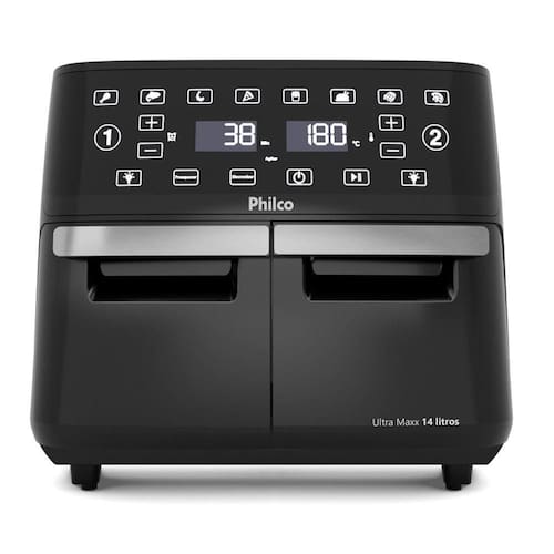 Especificações Potência: 2000W Capacidade: 14L (total sem divisor) / 3,5L (cesto) Controle de Temperatura: 40 a 200C Funções: 8 pré-programadas (assar, fritar, desidratar, reaquecer) Tipo de Controle: Digital Material: Metal, plástico e vidro Itens Inclusos Air Fryer Philco PAF14A 14L 3 Grelhas 1 Cesto antiaderente com 3,5L e alça removível Bandeja coletora de gordura e migalhas Divisor de lados Perguntas Frequentes (FAQ) Pergunta: Qual a voltagem da Air Fryer Philco PAF14A?