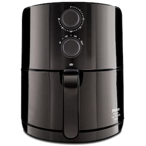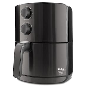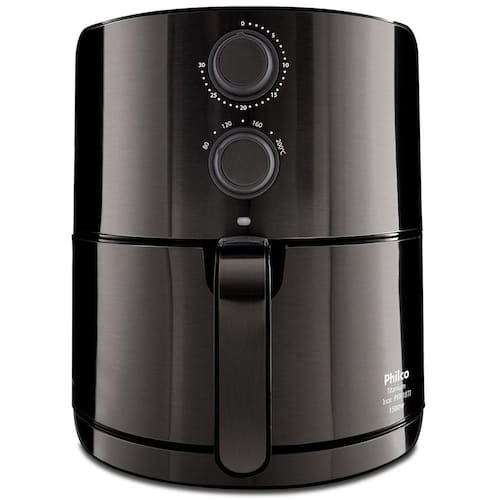 Fritadeira elétrica sem óleo Philco Titanium Inox com capacidade de 4,6L, potência de 1500W, timer de 30 minutos, temperatura ajustável de 80 a 200°C e cesto removível com revestimento antiaderente.Porta-fio